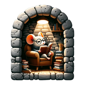 Mouse Reading Book In His Mouse Tunnel Chamber, Wall Decal Sticker Home Decor Mural - 3D Art Mouse Hole Design Cute Funny Gift 07