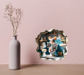 Mouse Sitting on Toilet Reading Newspaper - Whimsical Mouse Hole Wall Decal Sticker - 3D Cute Home Decor Mural - Funny Mouse Design 65