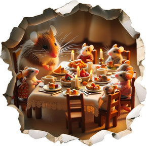 Mouse Family Dinner - Whimsical Mouse Hole Wall Decal Sticker - 3D Cute Home Decor Mural - Funny Dining Mouse Design 39