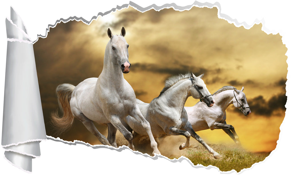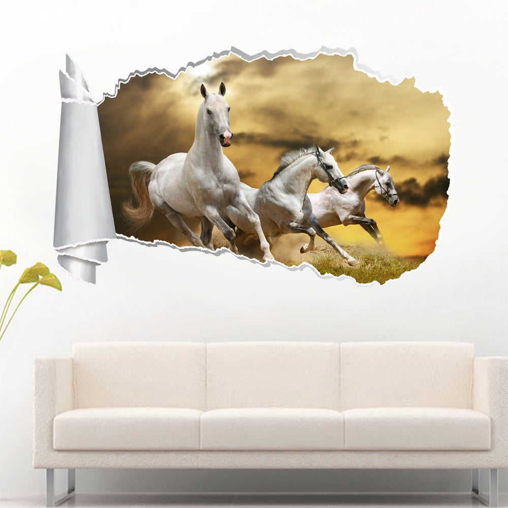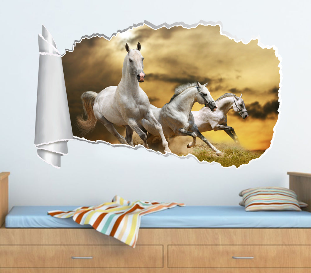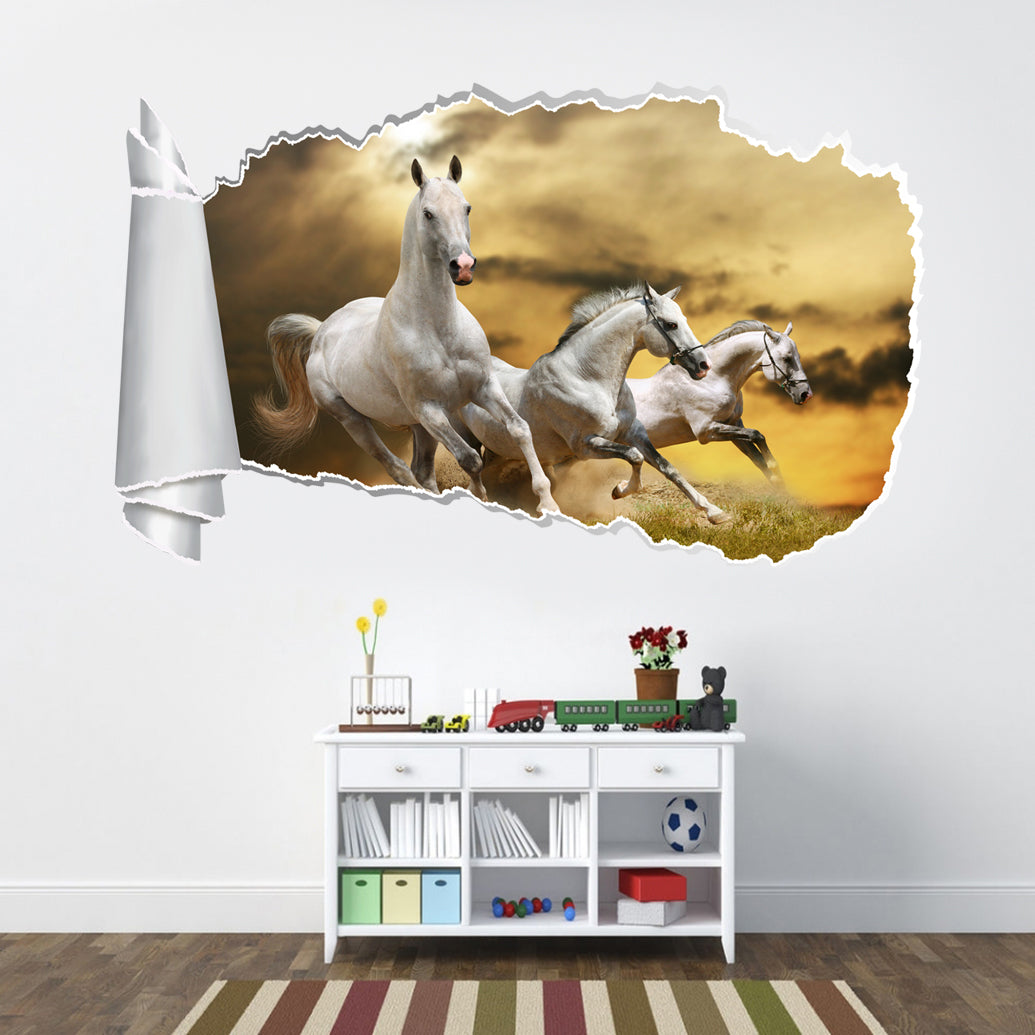Galloping White Horses 3D Torn Paper Hole Ripped Effect Decal Wall Sticker