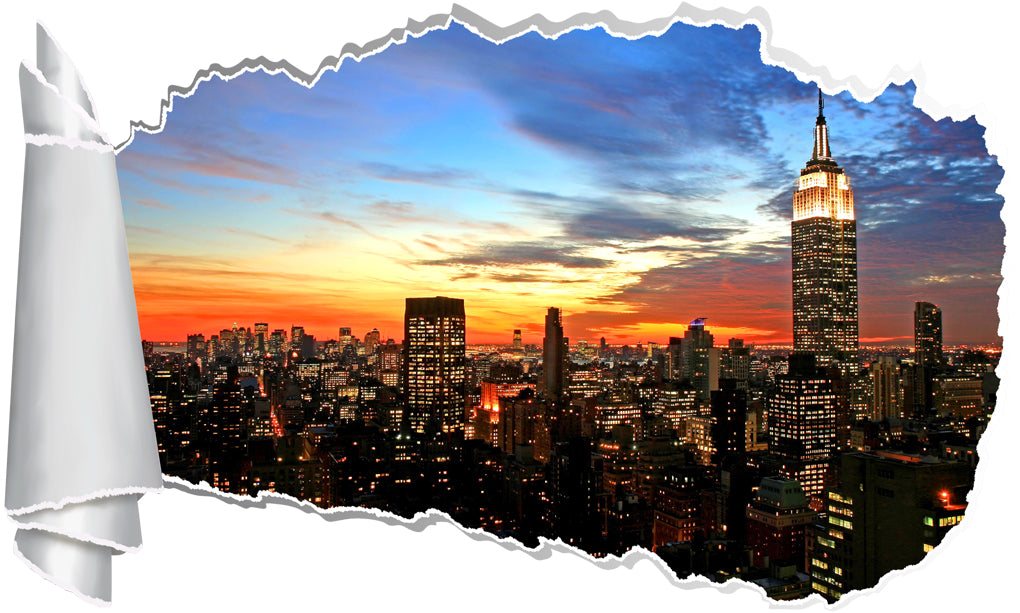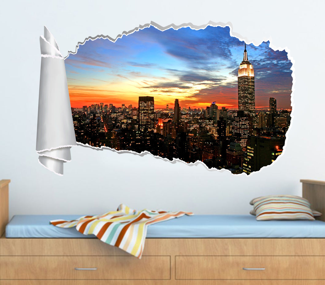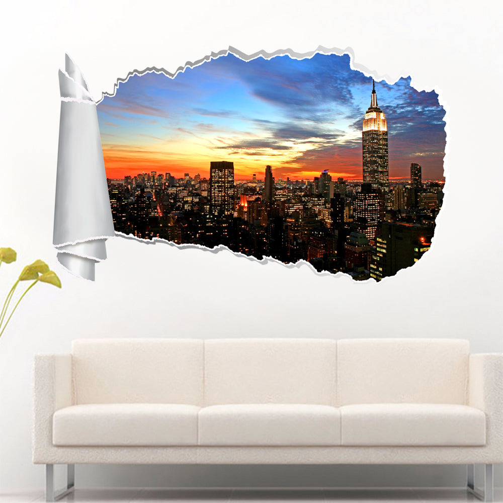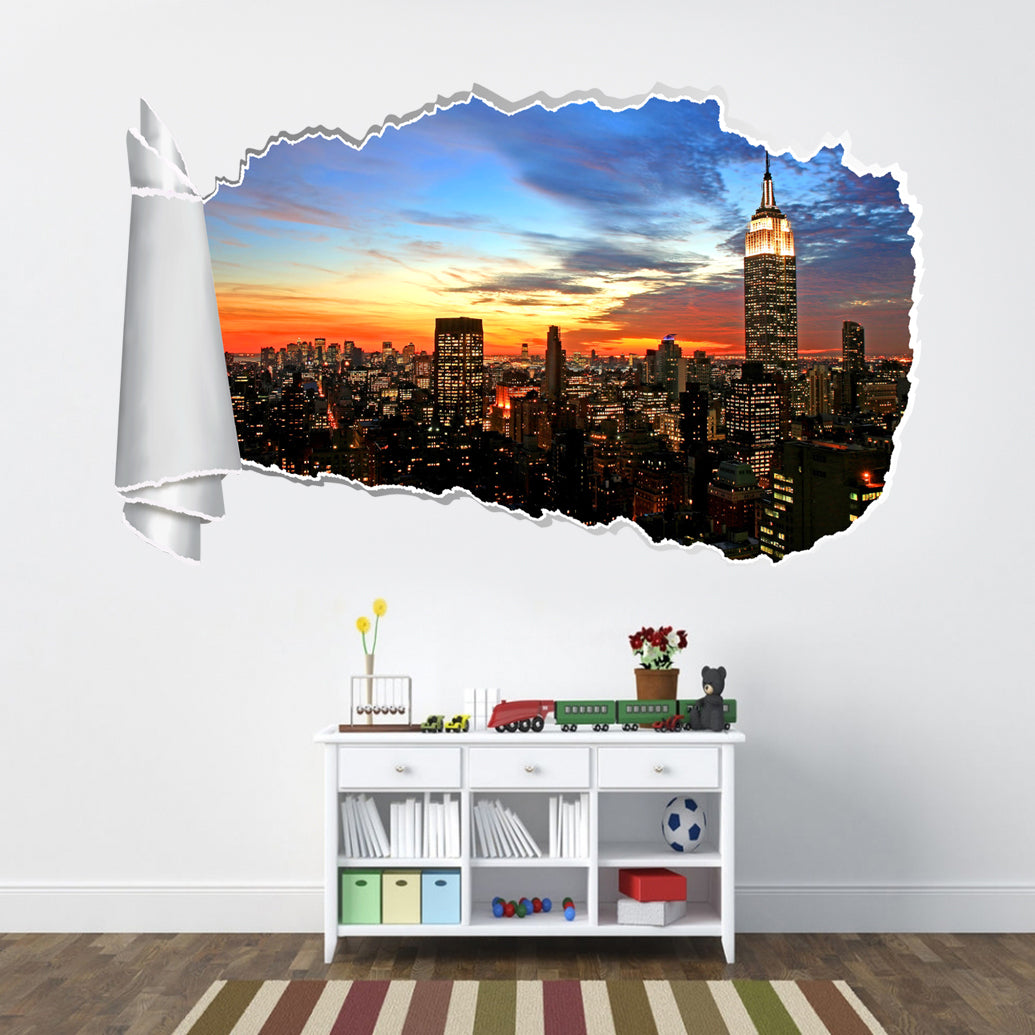 New York Skyline Sunset 3D Torn Paper Hole Ripped Effect Decal Wall Sticker